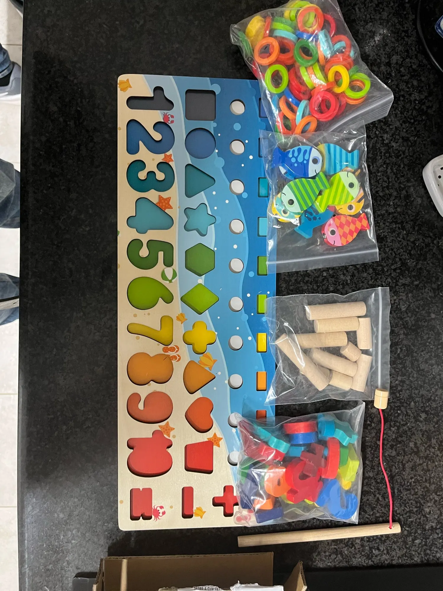 【5-in-1SET】Thenevergetboredfirstwood puzzlegames for toddler 3 yearsolds andup enjoysortingcolorsof therings,countingthe pieces, stackingblocks,namingthe colors, enjoy fishing,puttingthe counter rings onthe woodenpegs.