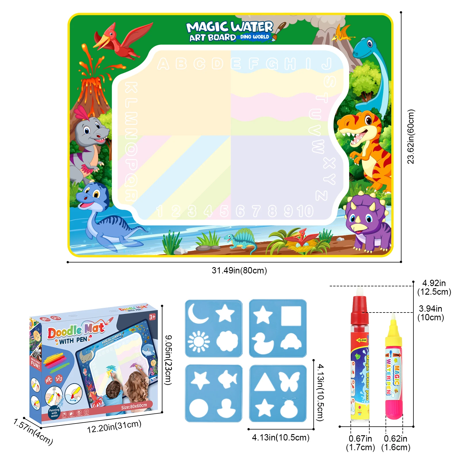 Fill the pen with clean water and draw on the magic drawing mat. After 3-10 minutes, it magically disappears (depending on temperature and airflow), and children can paint on the drawing mat again and again.