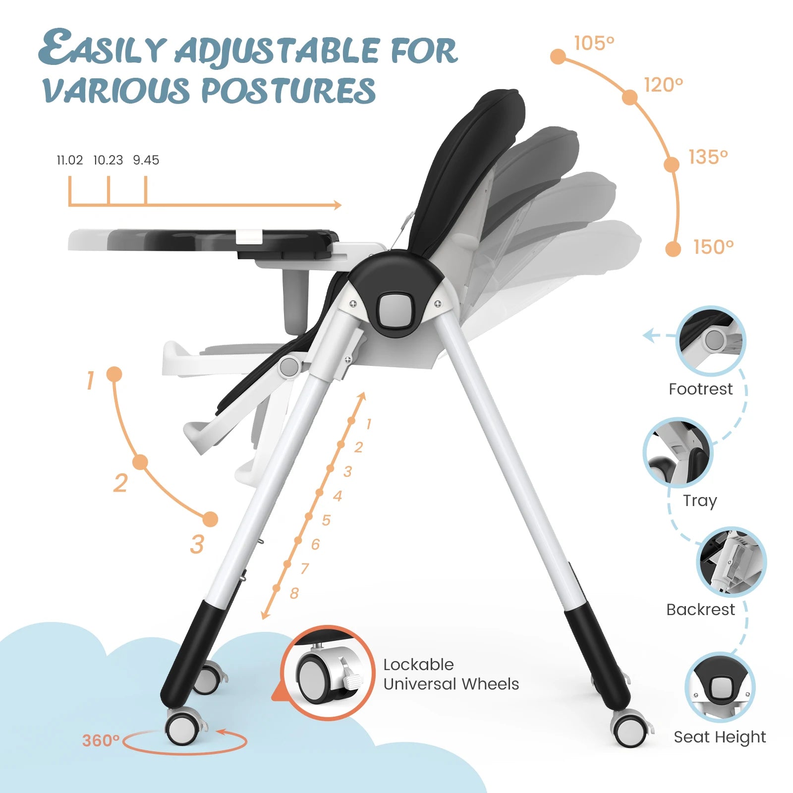 Sejoy Adjustable Baby High Chair with 5-Point Harness 3-Tier Tray & Wheels CE/CPC Certified Children's Dining Chair